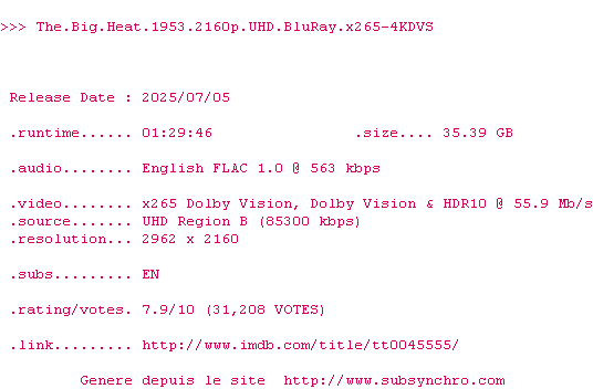 Voir le nfo de la release The.Big.Heat.1953.COMPLETE.UHD.BLURAY-4KDVS
