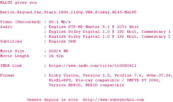 Voir le nfo de la release Battle.Beyond.The.Stars.1980.2160p.UHD.BluRay.H265-MALUS