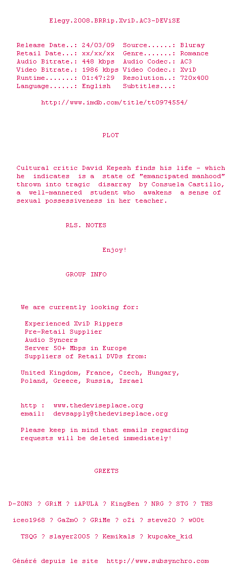 Voir le nfo de la release Elegy.2008.BRRip.XviD.AC3-DEViSE