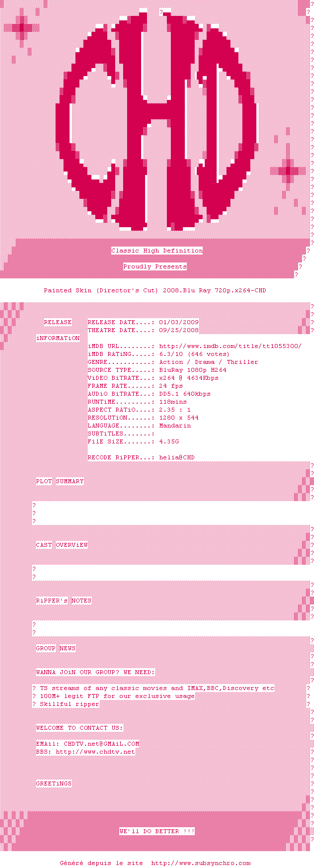 Voir le nfo de la release Painted.Skin.Directors.Cut.2008.BDRip.720p.x264.DTS-CHD