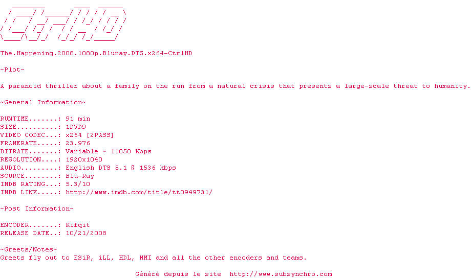 Voir le nfo de la release The.Happening.2008.1080p.Bluray.DTS.x264-CtrlHD