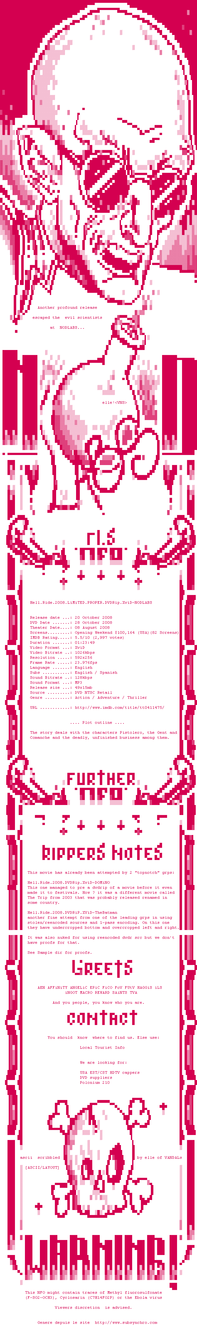 Voir le nfo de la release Hell.Ride.2008.LiMiTED.PROPER.DVDRip.XviD-NODLABS
