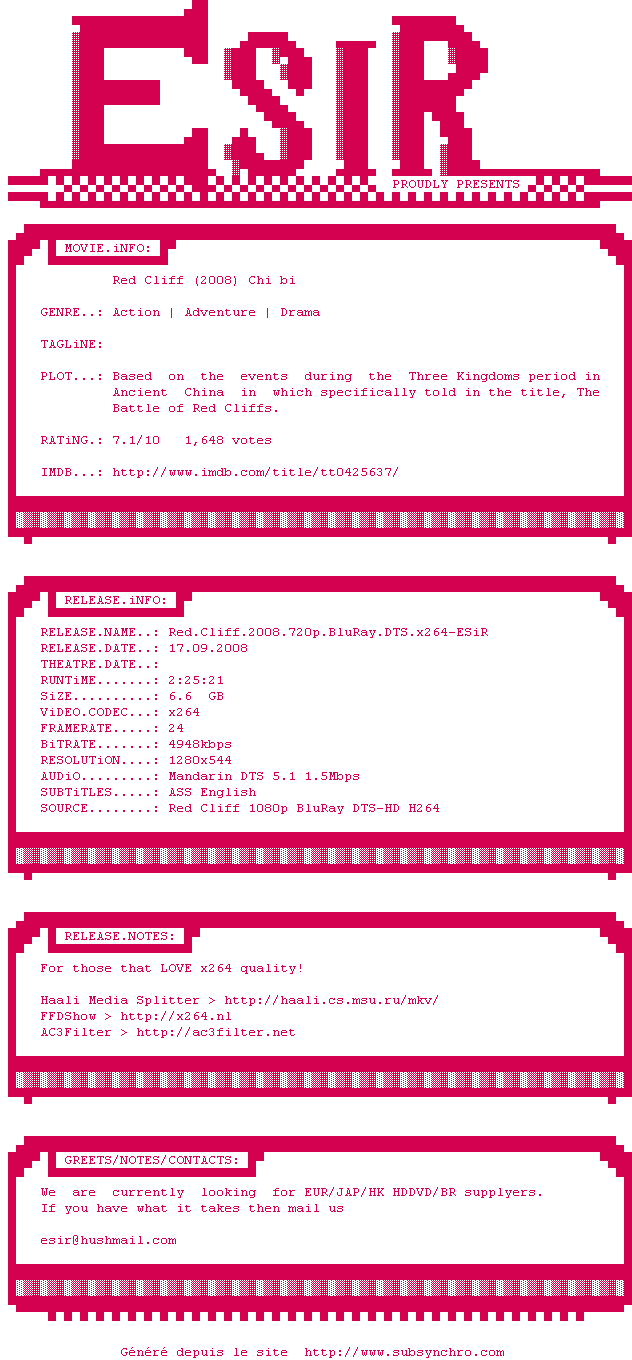 Voir le nfo de la release Red.Cliff.2008.720p.BluRay.DTS.x264-ESiR