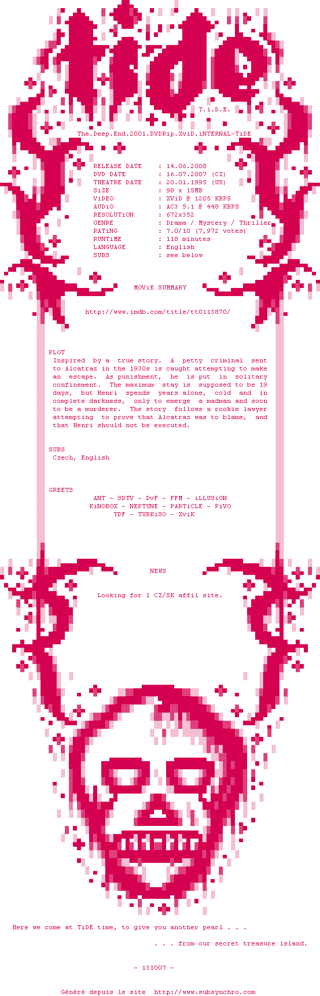 Voir le nfo de la release Murder.in.the.First.1995.DVDRip.XviD.iNTERNAL-TiDE