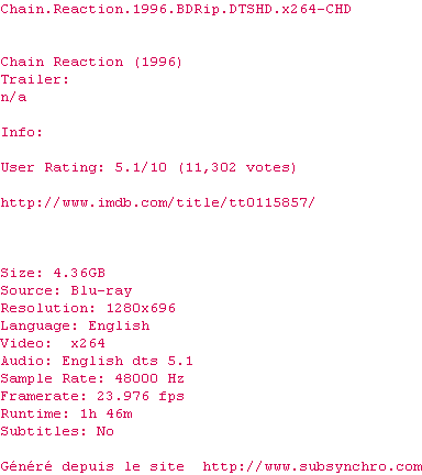 Voir le nfo de la release Chain.Reaction.1996.720p.BluRay.DTSHD.x264-CHD