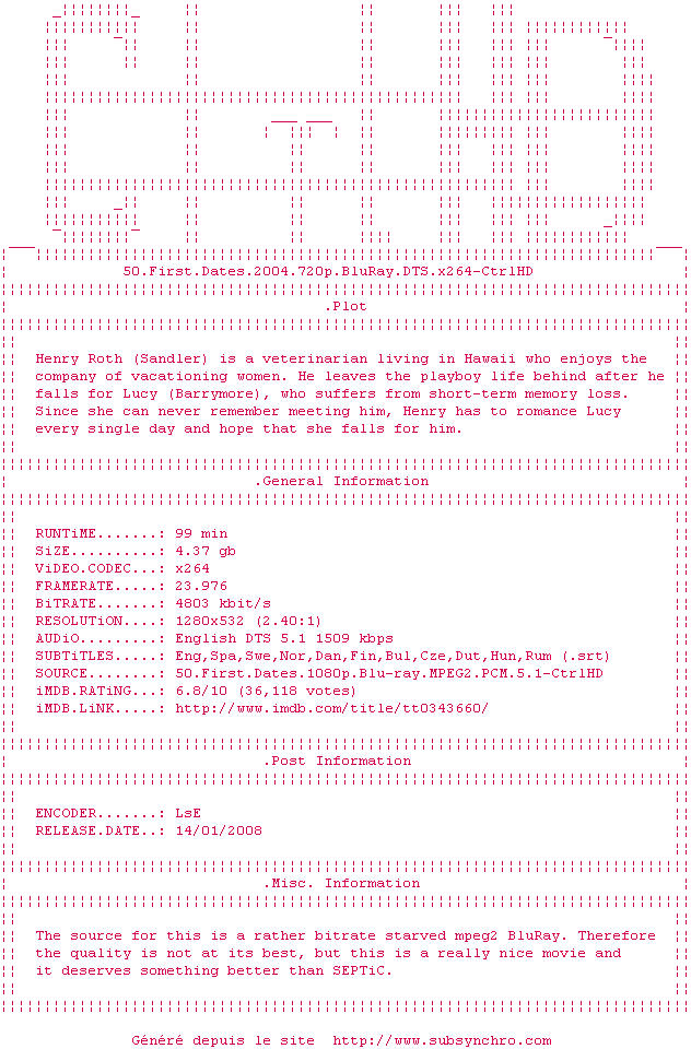 Voir le nfo de la release 50.First.Dates.2004.720p.BluRay.DTS.x264-CtrlHD