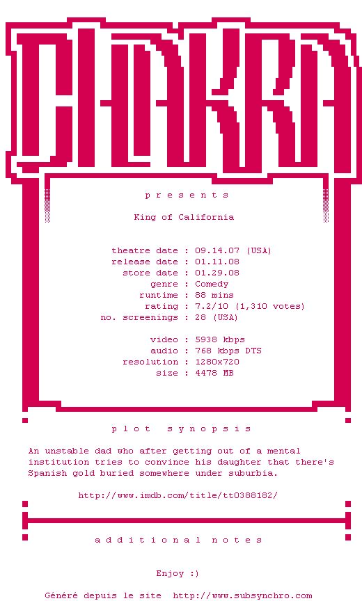 Voir le nfo de la release King.of.California.LIMITED.720p.Bluray.x264-Chakra