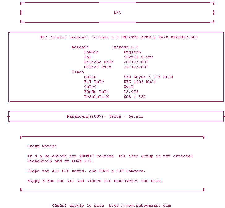 Voir le nfo de la release Jackass.2.5.UNRATED.DVDRip.XViD.READNFO-LPC