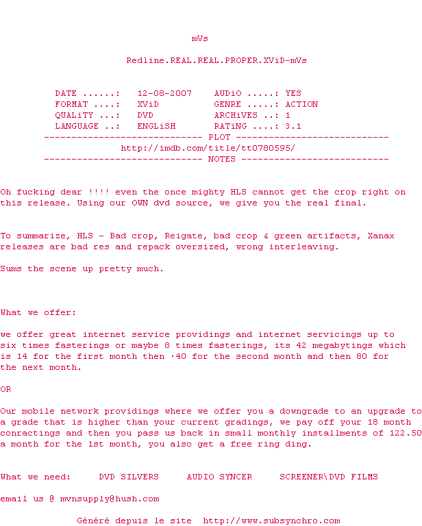 Voir le nfo de la release Redline.REAL.REAL.PROPER.XViD-mVs