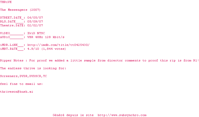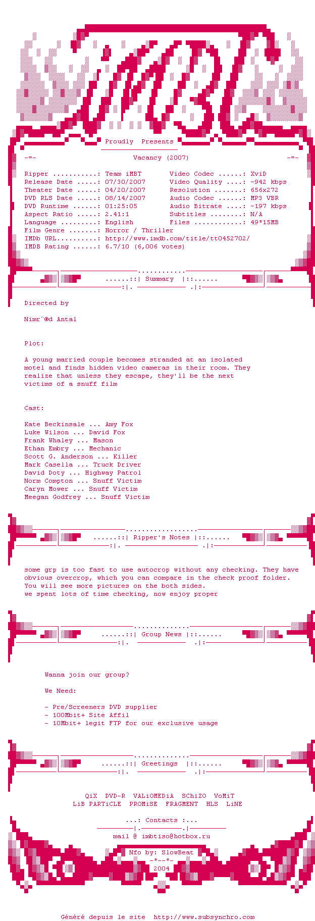 Voir le nfo de la release Vacancy.PROPER.DVDRip.XviD-iMBT