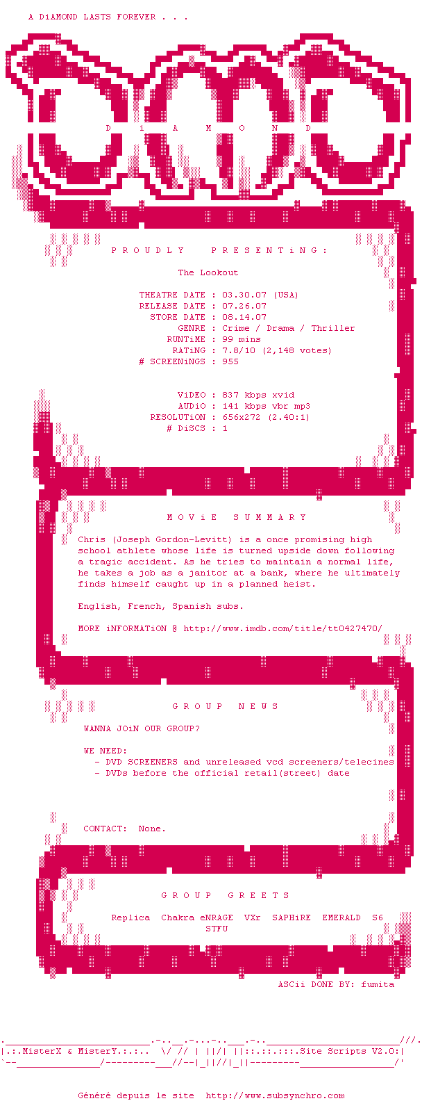 Voir le nfo de la release The.Lookout.DVDRip.XviD-DiAMOND