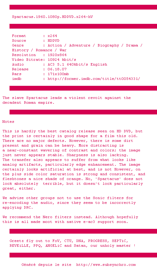 Voir le nfo de la release Spartacus.1960.1080p.HDDVD.x264-hV