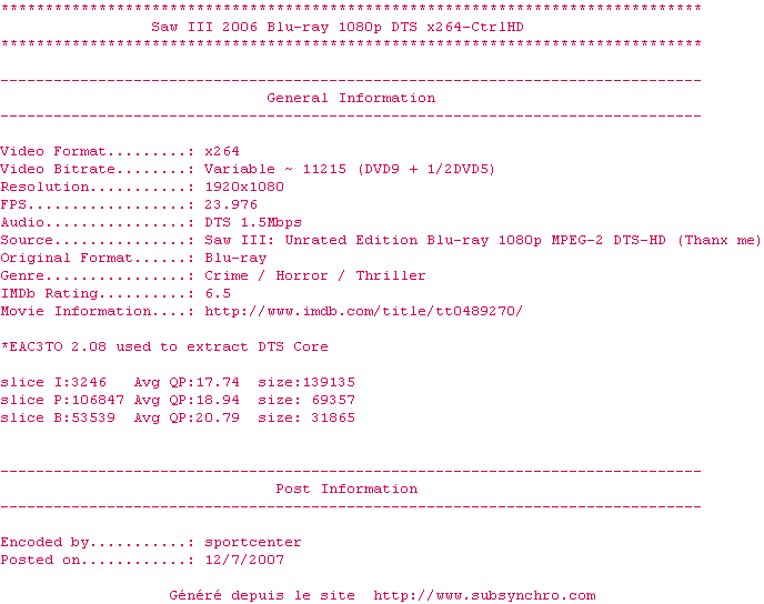 Voir le nfo de la release Saw.III.2006.1080p.BluRay.DTS.x264-CtrlHD