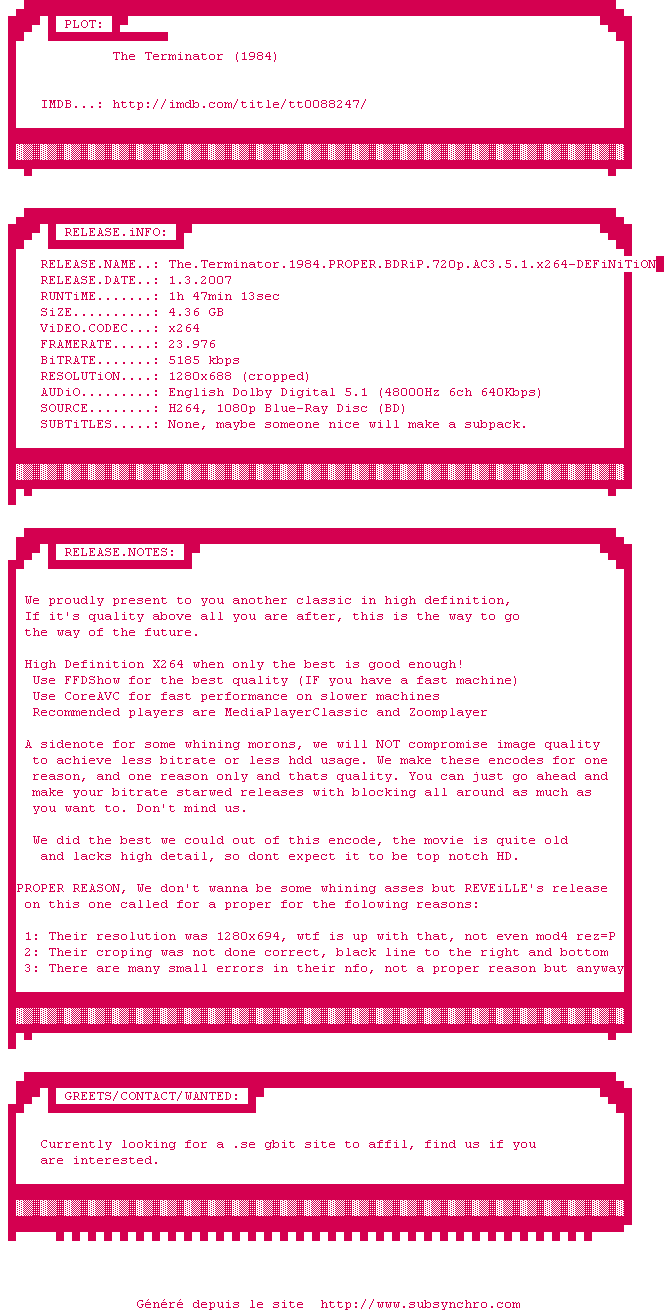 Voir le nfo de la release A.Scanner.Darkly.2006.DVDRiP.XViD-D0PE