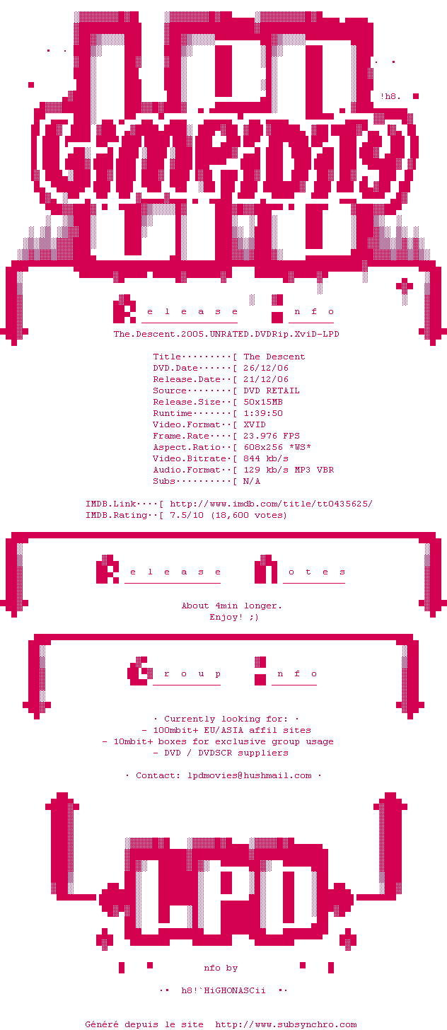 Voir le nfo de la release The.Descent.2005.UNRATED.DVDRip.XviD-LPD