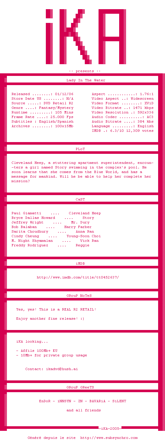 Voir le nfo de la release Lady.In.The.Water.2006.DVDRiP.XViD-iKA