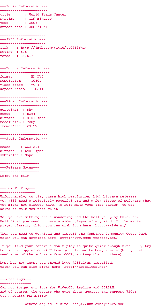 Voir le nfo de la release World.Trade.Center.2006.DVD9.720p.HDDVD.x264-REVEiLLE