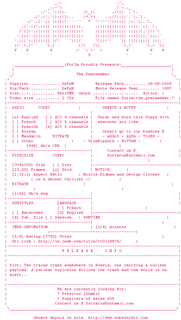 Voir le nfo de la release The.Peacemaker.1997.iNTERNAL.AC3.DVDRiP.XviD-ForZa