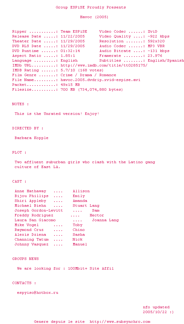 Voir le nfo de la release Havoc.2005.DVDRip.XviD-ESPiSE