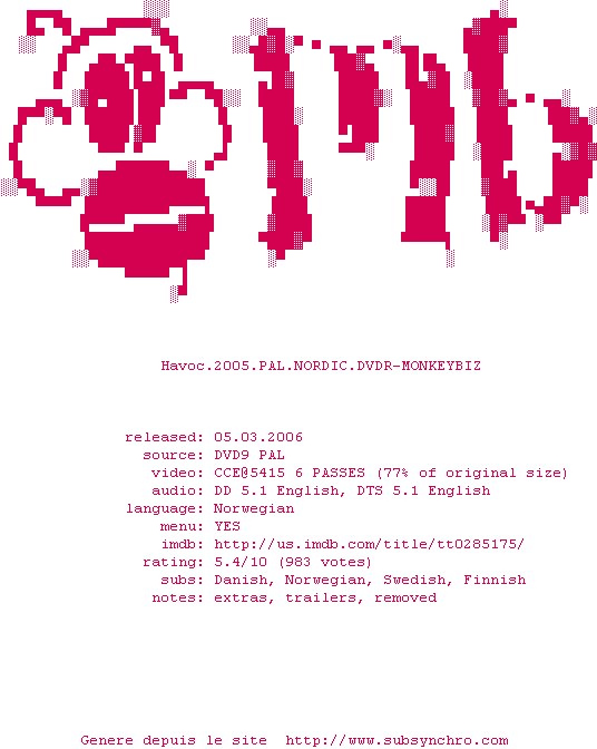 Voir le nfo de la release Havoc.2005.PAL.NORDIC.DVDR-MONKEYBIZ