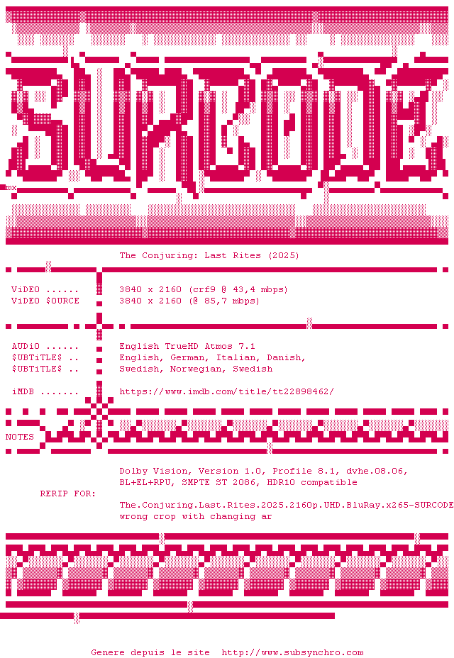 Voir le nfo de la release The.Conjuring.Last.Rites.2025.RERIP.2160p.UHD.BluRay.x265-SURCODE