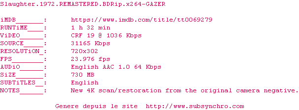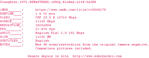 Voir le nfo de la release Slaughter.1972.REMASTERED.1080p.BluRay.x264-GAZER
