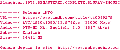 Voir le nfo de la release Slaughter.1972.REMASTERED.COMPLETE.BLURAY-INCUBO