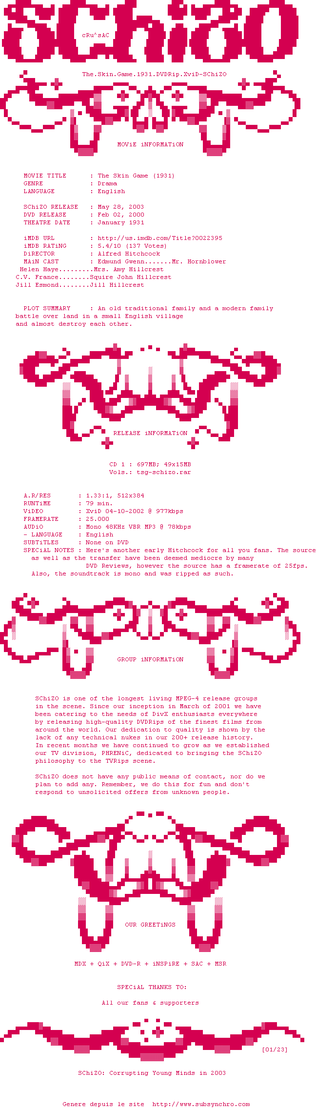Voir le nfo de la release The.Skin.Game.1931.DVDRip.XviD-SChiZO