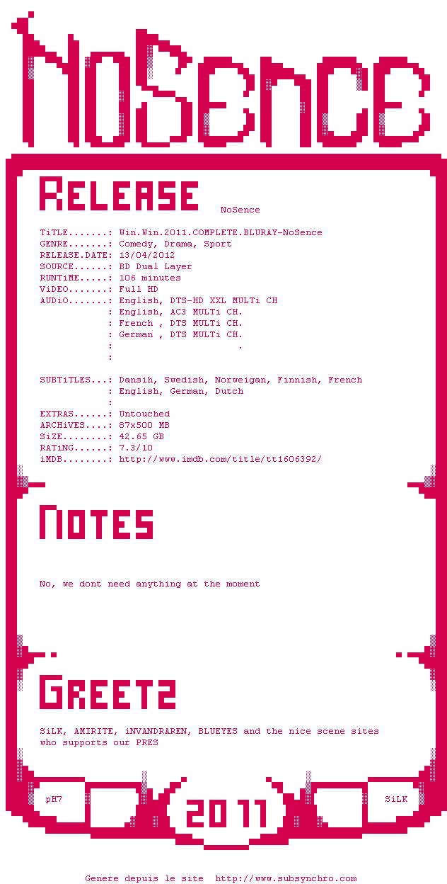 Voir le nfo de la release Win.Win.2011.COMPLETE.BLURAY-NoSence