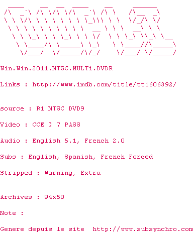 Voir le nfo de la release Win.Win.2011.NTSC.MULTi.DVDR-DUPLI