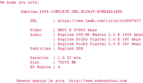 Voir le nfo de la release Sabrina.1954.2160p.UHD.BluRay.H265-MALUS