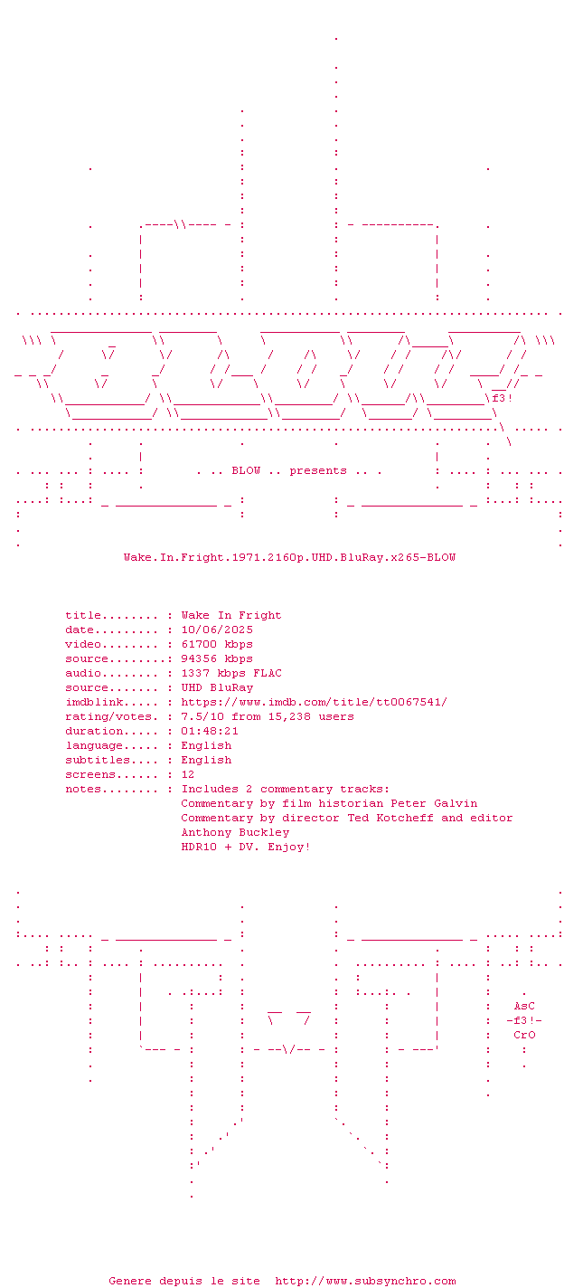 Voir le nfo de la release Wake.In.Fright.1971.2160p.UHD.BluRay.x265-BLOW