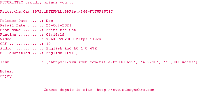 Voir le nfo de la release Fritz.The.Cat.1972.iNTERNAL.BDRip.x264-FUTURiSTiC