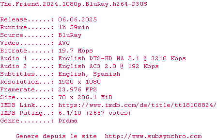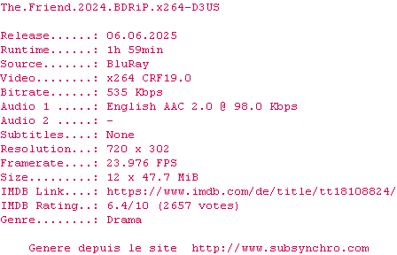 Voir le nfo de la release The.Friend.2024.BDRiP.x264-D3US