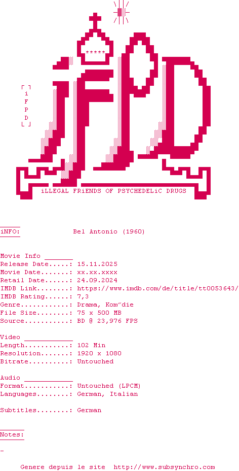 Voir le nfo de la release Bel.Antonio.1960.DUAL.COMPLETE.BLURAY-iFPD