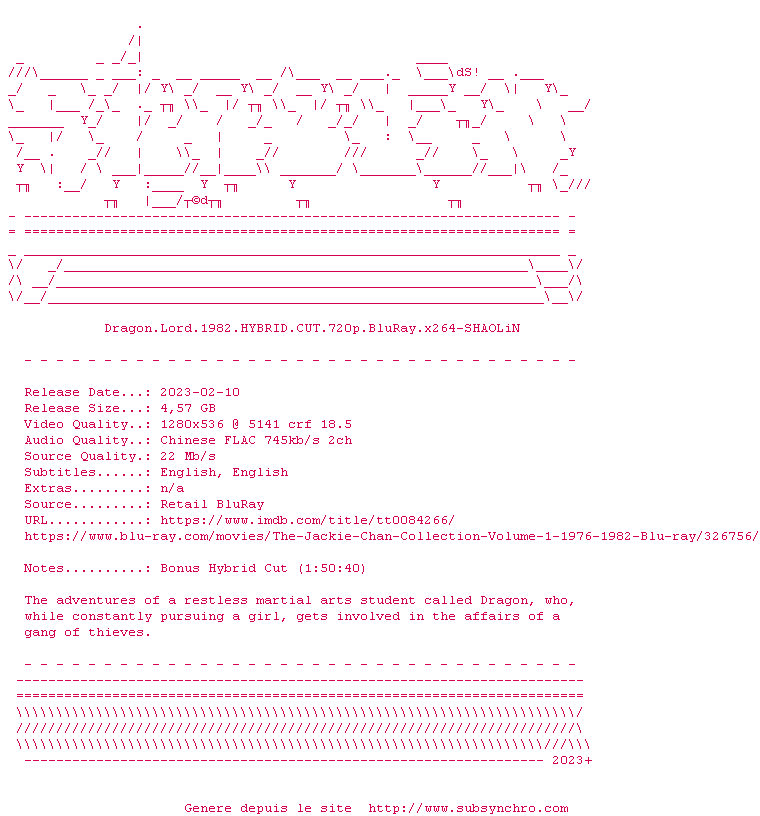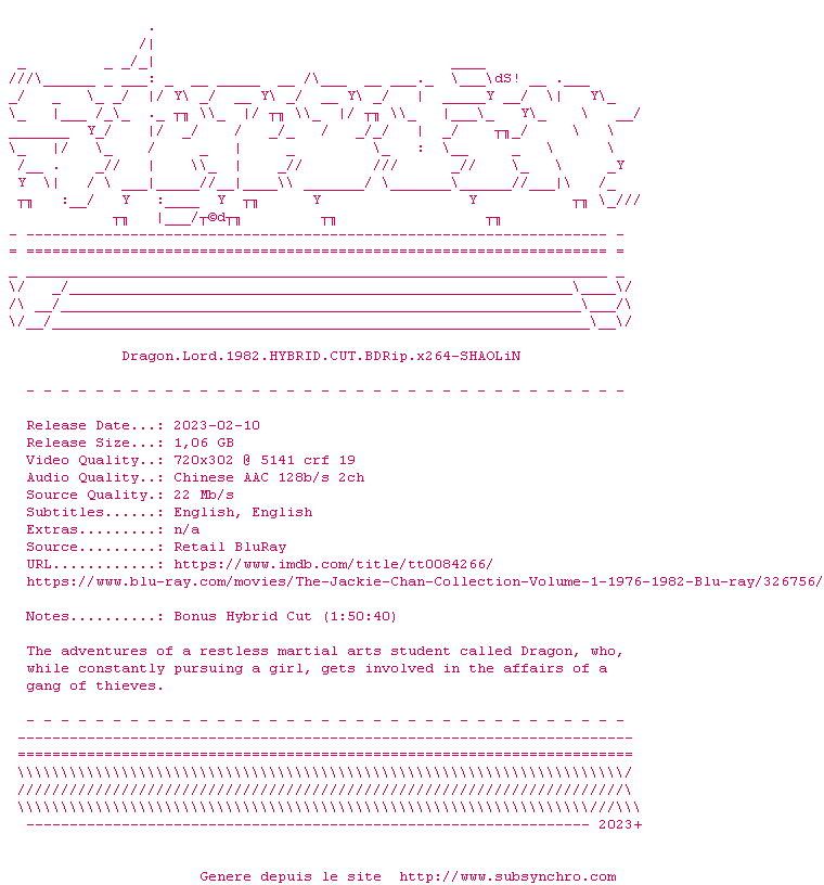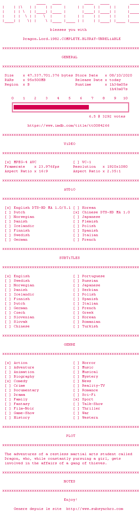 Voir le nfo de la release Dragon.Lord.1982.HYBRID.CUT.1080p.BluRay.x264-SHAOLiN