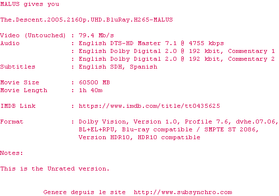 Voir le nfo de la release The.Descent.2005.2160p.UHD.BluRay.H265-MALUS