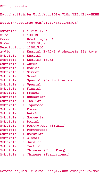 Voir le nfo de la release May.The.12th.Be.With.You.2024.720p.WEB.H264-MEHH
