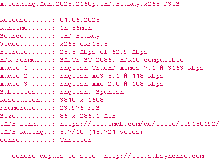 Voir le nfo de la release A.Working.Man.2025.2160p.UHD.BluRay.H265-D3US