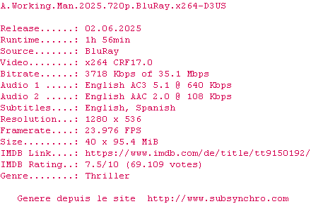Voir le nfo de la release A.Working.Man.2025.720p.BluRay.x264-D3US