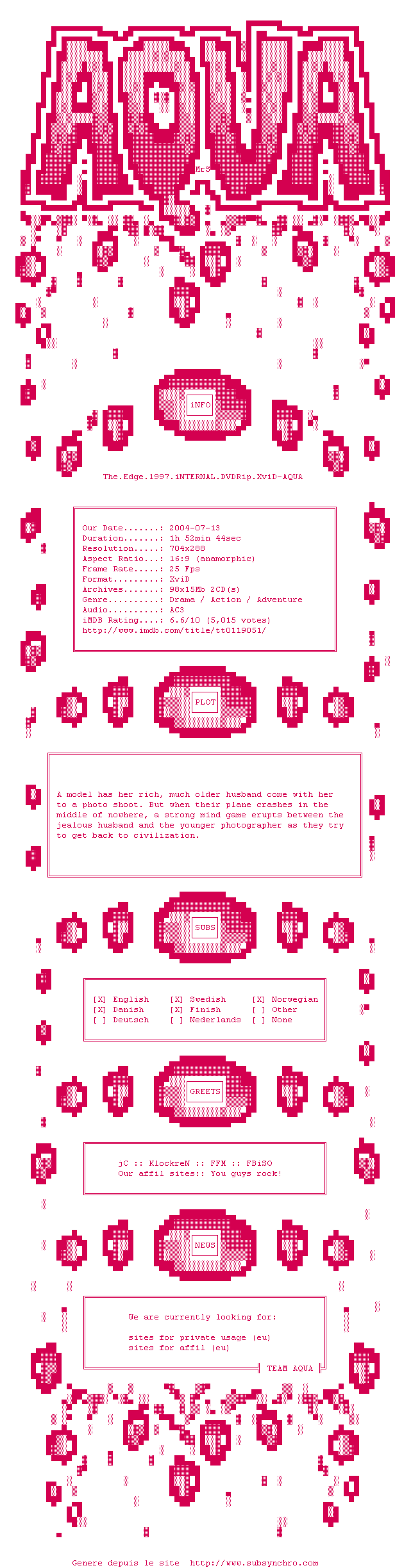 Voir le nfo de la release The.Edge.1997.iNTERNAL.DVDRip.XviD-AQUA