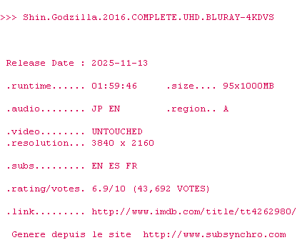 Voir le nfo de la release Shin.Godzilla.2016.COMPLETE.UHD.BLURAY-4KDVS