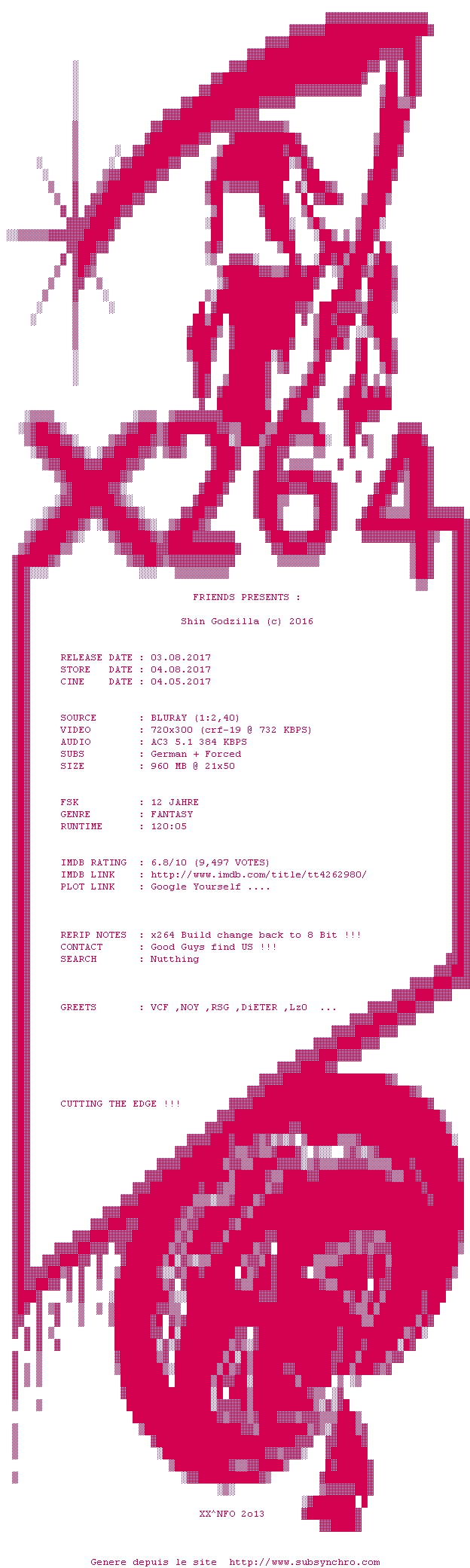 Voir le nfo de la release Shin.Godzilla.German.2016.AC3.RERiP.BDRiP.x264-XF