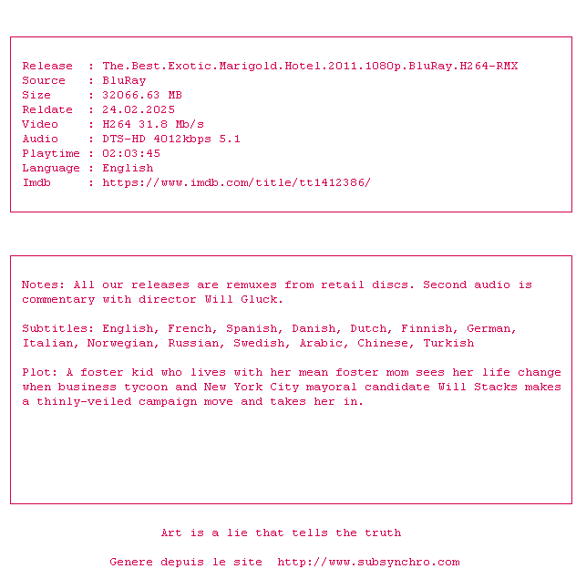 Voir le nfo de la release The.Best.Exotic.Marigold.Hotel.2011.1080p.BluRay.H264-RMX