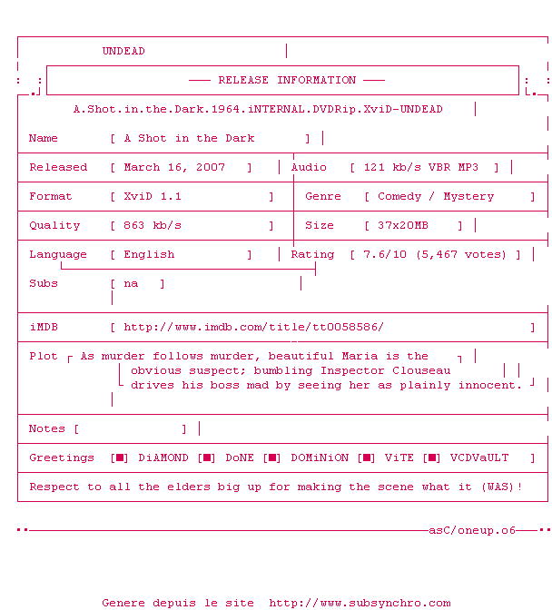 Voir le nfo de la release A.Shot.In.The.Dark.1964.iNTERNAL.DVDRip.XviD-UNDEAD