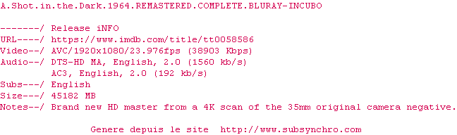 Voir le nfo de la release A.Shot.In.The.Dark.1964.REMASTERED.COMPLETE.BLURAY-INCUBO