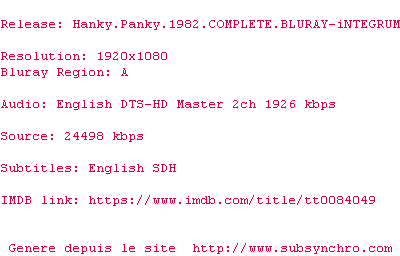 Voir le nfo de la release Hanky.Panky.1982.COMPLETE.BLURAY-iNTEGRUM