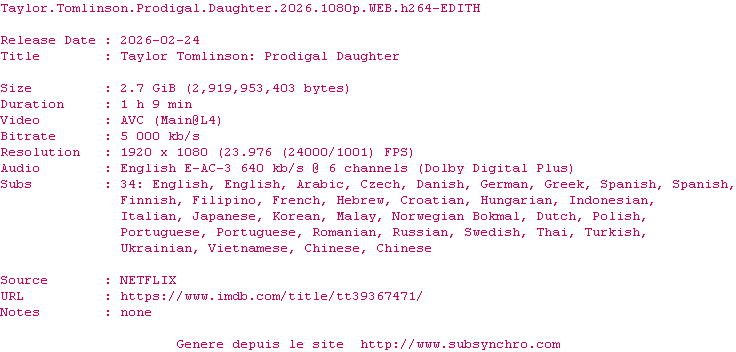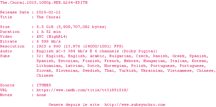 Voir le nfo de la release The.Choral.2025.1080p.WEB.H264-EDITH