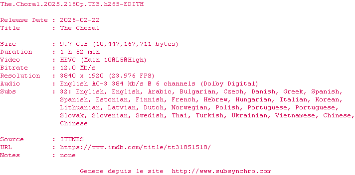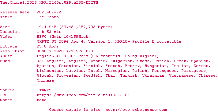 Voir le nfo de la release The.Choral.2025.HDR.2160p.WEB.H265-EDITH