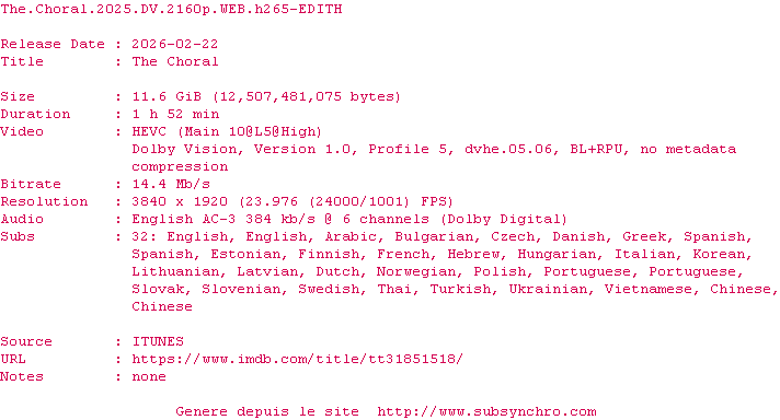 Voir le nfo de la release The.Choral.2025.DV.2160p.WEB.H265-EDITH